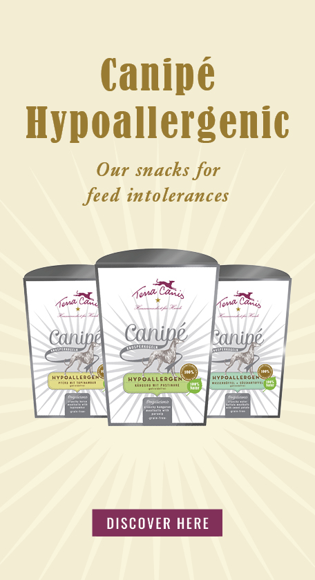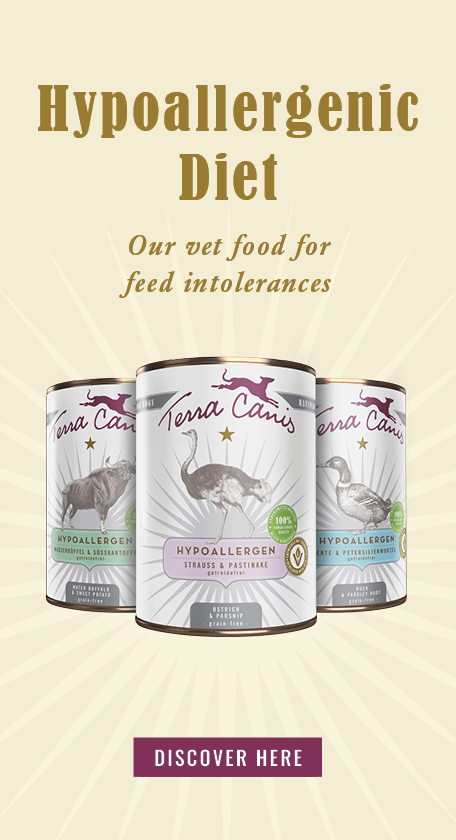 2. Commercial food consisting of one protein and one carbohydrate source that the animal has never eaten before. This method is possible with our Terra Canis hypoallergenic menus: hypoallergenic dog food – particularly suitable for intolerances