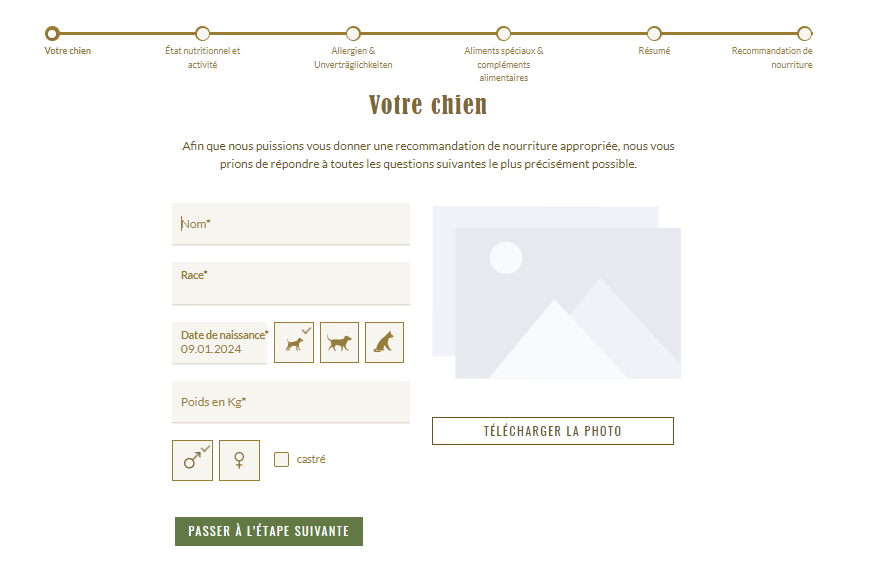 - Pour les trois illustrations situées à côté de la date de naissance, vous pouvez choisir dans quelle phase de vie se trouve votre chien: Chiot, adulte ou senior.
