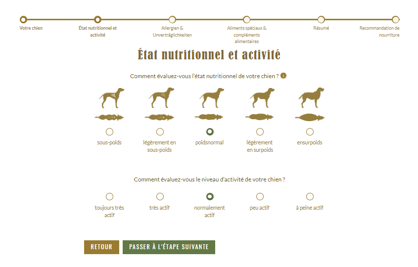 Dans l’étape suivante, le guide-conseil en alimentation a besoin d’informations plus précises sur l’état nutritionnel et le niveau d’activité de votre chien. Essayez d’évaluer votre chien le plus objectivement possible.