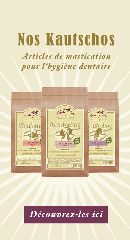 Tout comme les humains, certains chiens sont plus ou moins sujets aux problèmes dentaires en raison de la dureté naturelle de leurs dents. Les chiens présentant une malocclusion dentaire sont particulièrement prédisposés aux inflammations des dents/des gencives ou aux caries, car il y a souvent de nombreuses niches dans lesquelles s’accrochent trop facilement le tartre et les bactéries. Le brossage des dents du chien est une bonne façon de prévenir les maladies dentaires chez les animaux à la dentition sensible. Un brossage régulier permet d’éliminer les dépôts de nourriture et de limiter la formation de tartre. Pour cela, seuls des « outils de brossage » spéciaux fournis par le vétérinaire doivent être utilisés. Nos outils dentaires à nous ne sont pas adaptés à nos amis à quatre pattes. Les brosses à dents sont généralement beaucoup trop dures pour les gencives sensibles des chiens et nos variantes de dentifrice à la menthe au goût prononcé sont tout sauf rafraîchissantes pour le palais du chien. En plus des soins dentaires, une condition de base pour des dents saines chez le chien est l’utilisation d’une nourriture saine qui ne contient absolument aucun sucre ni autres édulcorants, car de tels ingrédients rendent très vite friables et malades les dents du chien, même si elles sont saines.