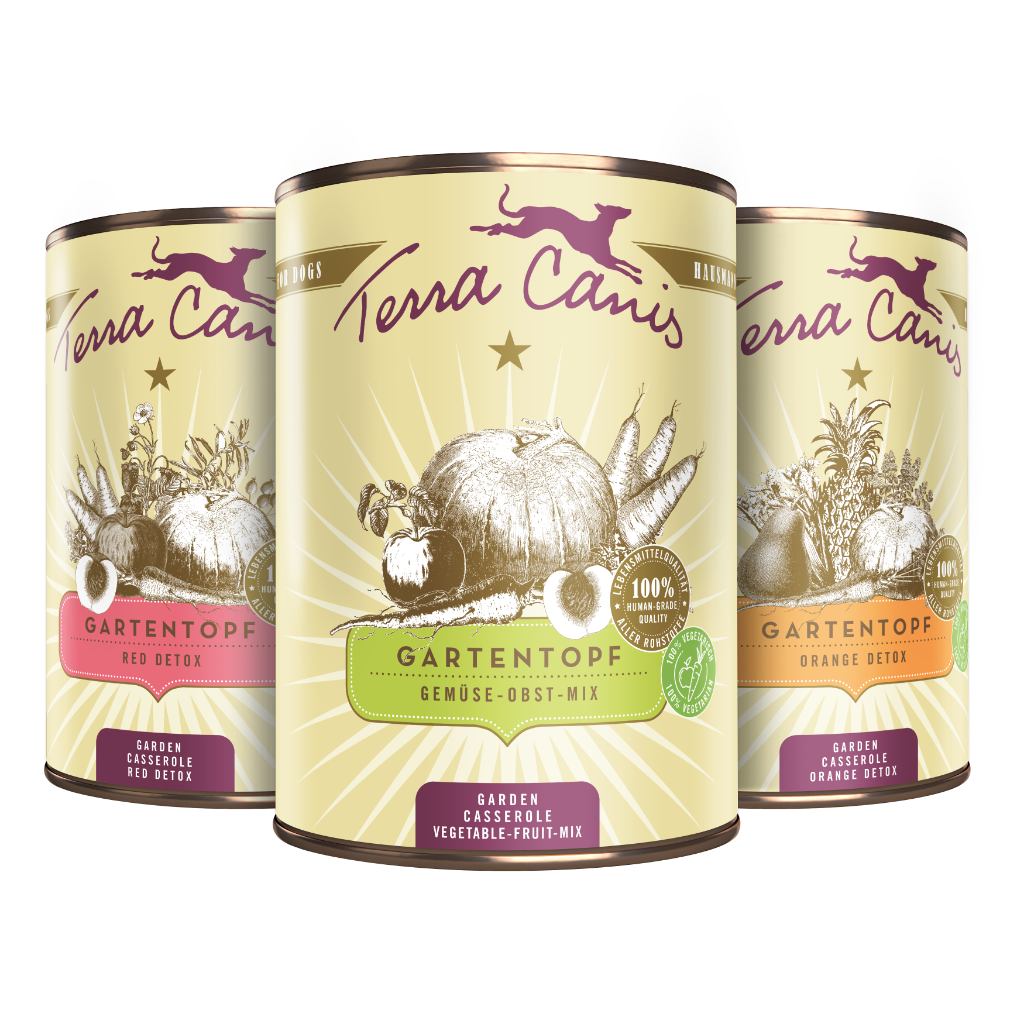 Die Gartentöpfe sind keine Alleinfuttermittel, sondern pflanzliche Ergänzungen. Während die klassischen Terra Canis-Menüs bereits eine vollständige Mahlzeit bilden, ergänzen die Gartentöpfe diese um frische, pflanzliche Vielfalt aus Gemüse, Kräutern und Früchten.