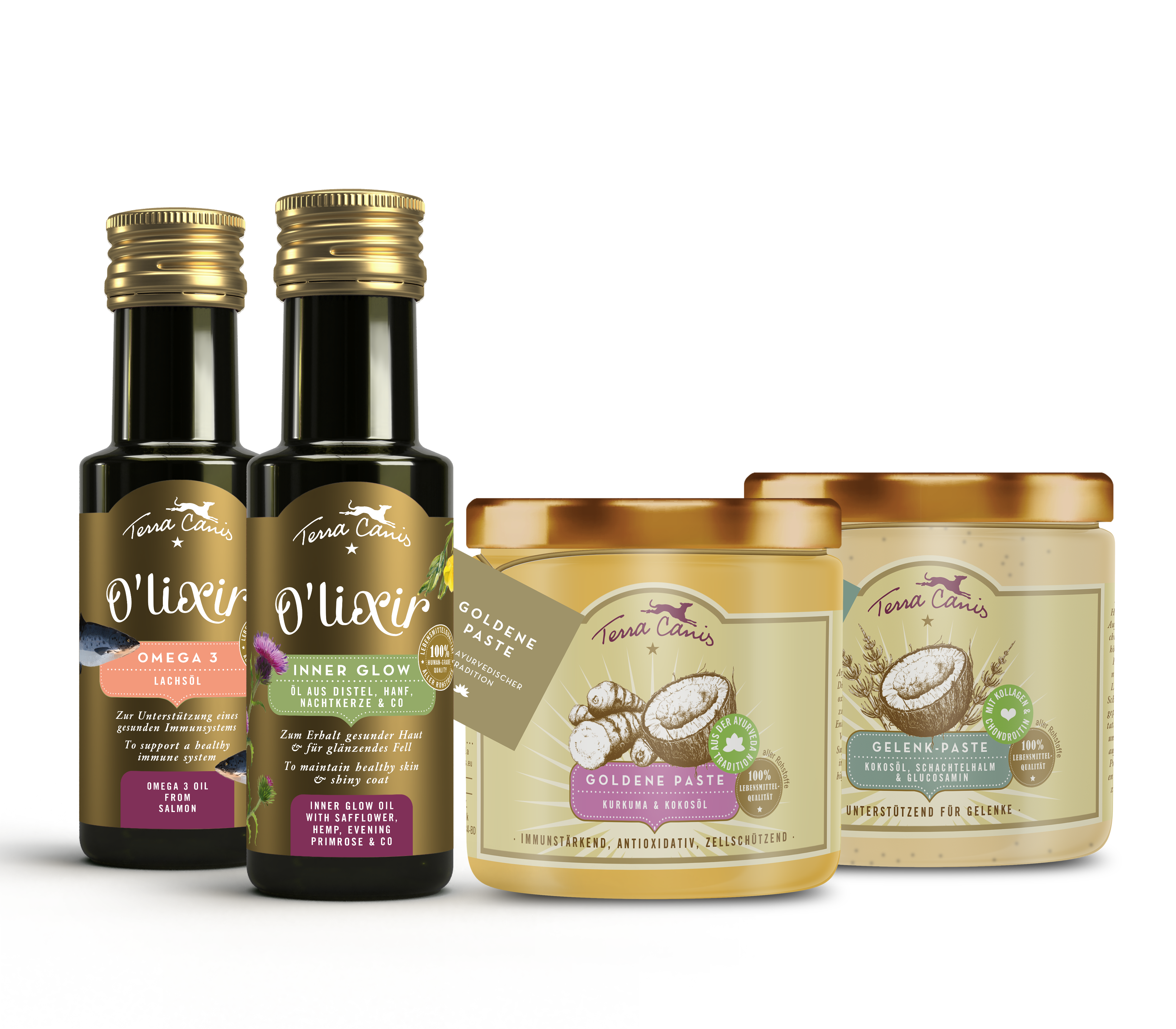 Mit der Produktlinie „O’lixir“ bietet Terra Canis vier hochwertige Öle in 100 % Lebensmittelqualität – ideal zur täglichen Versorgung mit essenziellen Fettsäuren. Ob für Haut, Fell, Immunsystem oder zur antioxidativen Unterstützung. Die Terra Canis Ergänzungs-Pasten vereinen altbewährte Naturheilkunde mit moderner Tierernährung. Basierend auf Kokosöl und ergänzt durch wertvolle Naturwirkstoffe wie Kurkuma, Propolis, Manuka-Honig oder Teufelskralle unterstützen sie gezielt bei häufigen Beschwerden. Ideal für Hunde jeden Alters und jeder Rasse. Einfach ins Futter mischen und natürlich wirken lassen.