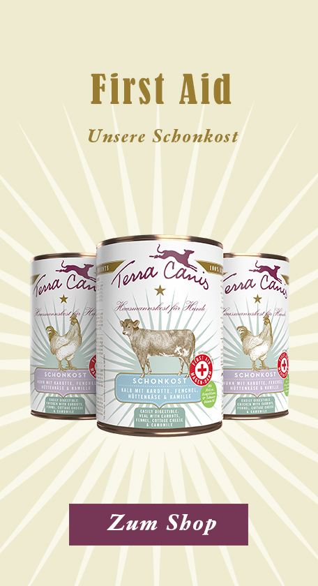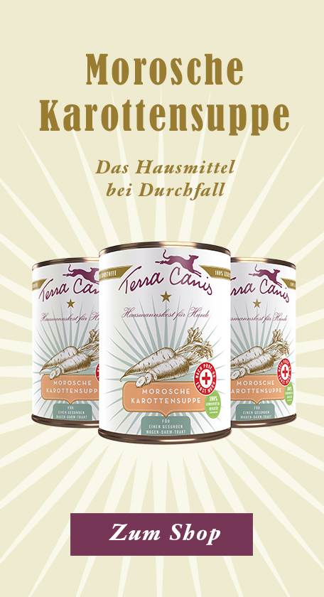 Da bei akuten Magen-Darm-Problemen häufig die Ursache gar nicht festgestellt werden kann, wählt man bei unkomplizierten Verläufen in der Regel eine symptomatische Behandlung, d. h. man kann bei Bedarf in Rücksprache mit dem behandelnden Tierarzt leichte Schmerzmedikamente einsetzen und zusätzlich den Magen-Darm-Trakt mit Schonkost entlasten. Hier eignet sich unsere First Aid Schonkost sowie die Morosche Karottensuppe optimal: Schonkost Hundefutter bei Magen-Darm von Terra Canis