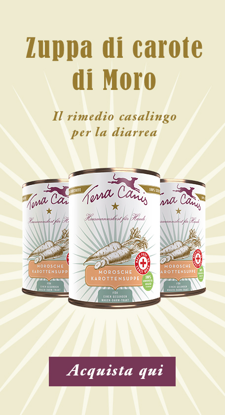 Poiché nel caso di problemi gastrointestinali acuti spesso non è possibile determinare la causa, in assenza di decorsi privi di complicazioni solitamente si opta per una terapia sintomatica: laddove necessario e dopo essersi consultati con il veterinario, si ricorre a leggeri antidolorifici e, inoltre, si evita di appesantire il tratto gastrointestinale adottando un’alimentazione leggera. In casi simili, il nostro alimento dietetico First Aid e la zuppa di carota alla Moro sono un’ottima scelta: alimento dietetico per cani con problemi gastrointestinali di Terra Canis