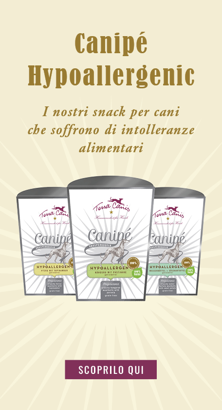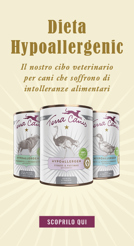 2. Cibo disponibile in commercio composto da una fonte di proteine e una di carboidrati che l’animale non ha mai consumato. Questo metodo è possibile utilizzando i menù ipoallergenici di Terra Canis: cibo per cani ipoallergenico: particolarmente adatto in caso di intolleranze